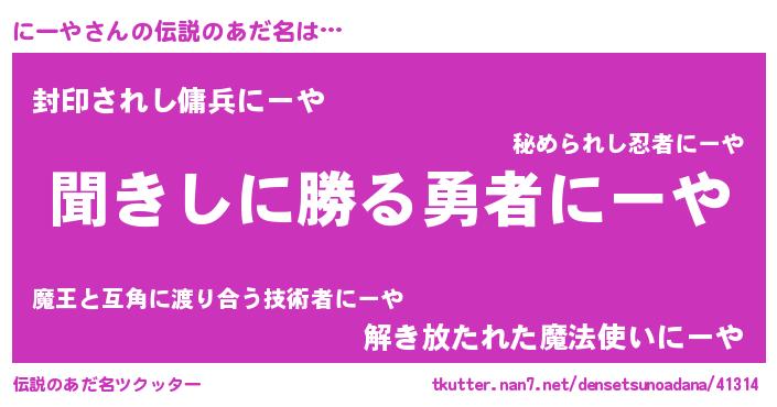 | 男性向けラノベタイトル風あだ名 | 『魔弾の王とにーや』『にーやの憂鬱』 |