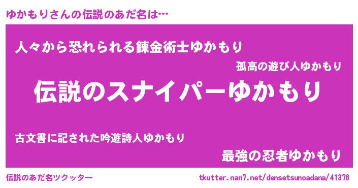 | 男性向けラノベタイトル風あだ名 | 『魔弾の王とゆかもり』『ゆかもりの憂鬱』 |
