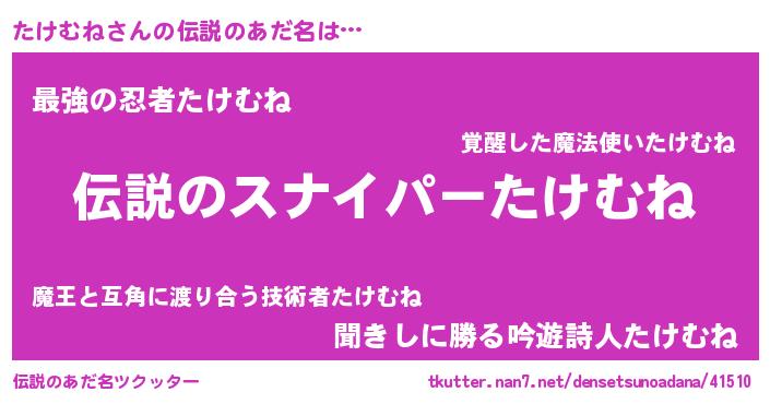 | 男性向けラノベタイトル風あだ名 | 『たけむねの憂鬱』 |