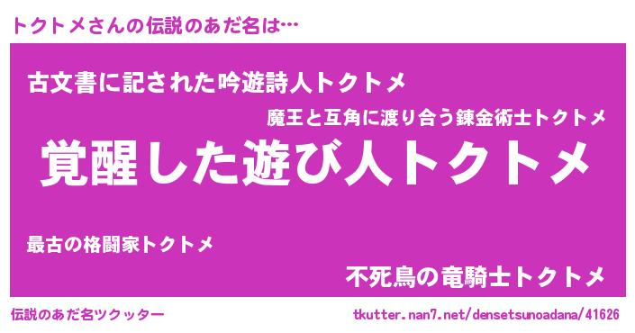 | ヒーロー風カッコイイあだ名 | 『仮面トクダー』『究極戦士トクトメ』 |