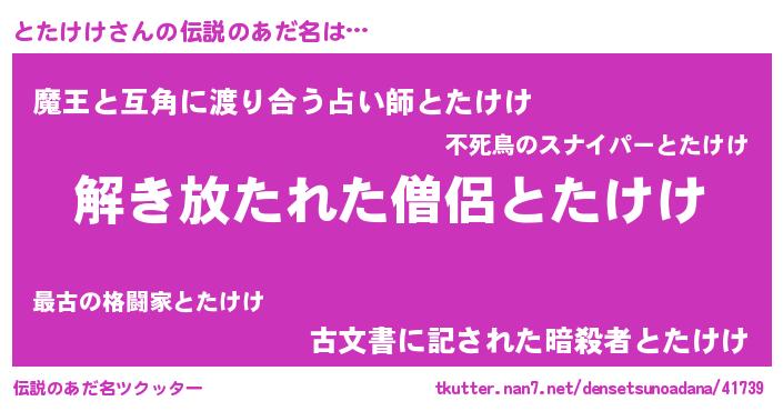 | 意味不明あだ名 | 『とにかく怪しいとたけけ』 |