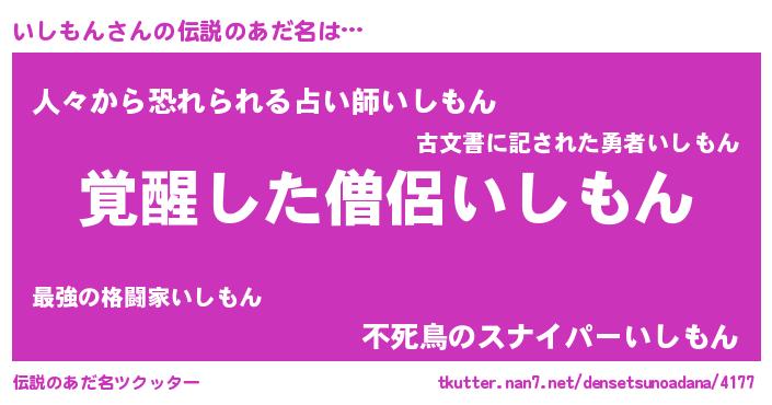 | 男性向けラノベタイトル風あだ名 | 『いしもん~年齢イコール彼女いない歴の魔法使い~』 |