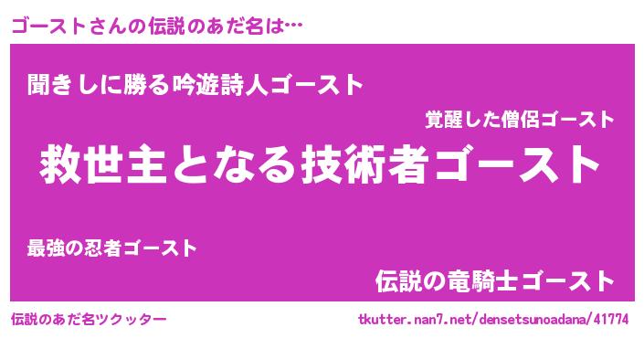 | 男性向けラノベタイトル風あだ名 | 『ゴースト~年齢イコール彼女いない歴の魔法使い~』 |