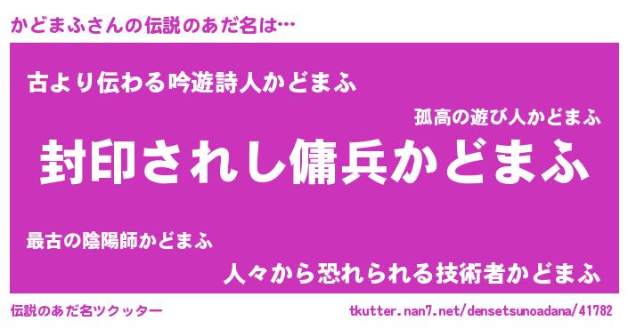 | 男性向けラノベタイトル風あだ名 | 『かどまふに滅ぼされるだけの簡単なお仕事です』 |