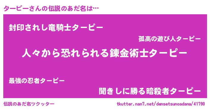 | 男性向けラノベタイトル風あだ名 | 『おまえをオタクにしてやるから、俺をターピーにしてくれ! 』 |