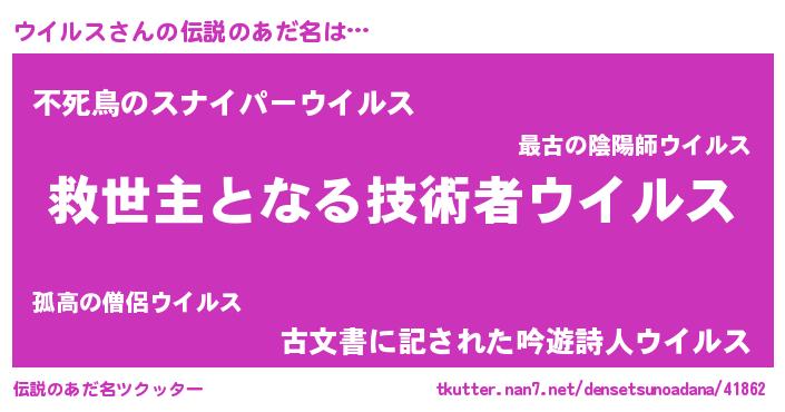 | 男性向けラノベタイトル風あだ名 | 『ウイルス~年齢イコール彼女いない歴の魔法使い~』 |