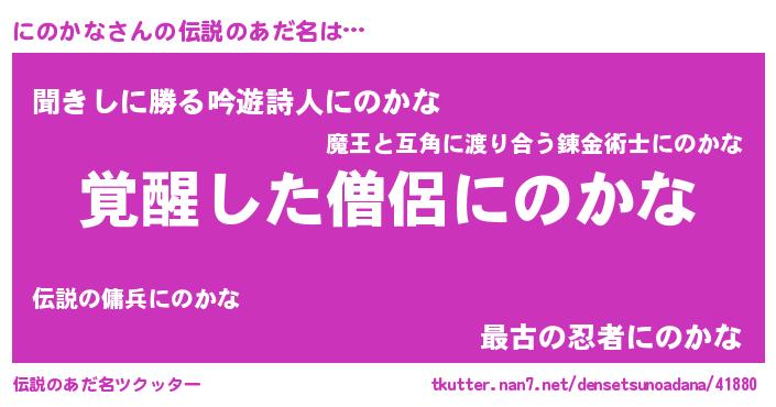 | 男性向けラノベタイトル風あだ名 | 『にのかなの嫁は女の子じゃないと思った?』 |