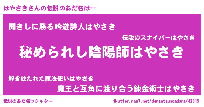 | 意味不明あだ名 | 『めかぶ科はやさき属』『自称はやさき』 |