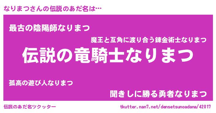 | 男性向けラノベタイトル風あだ名 | 『魔弾の王となりまつ』『なりまつの憂鬱』 |
