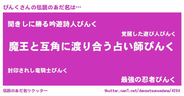 | 男性向けラノベタイトル風あだ名 | 『この素晴らしい世界にぴんくを!』 |