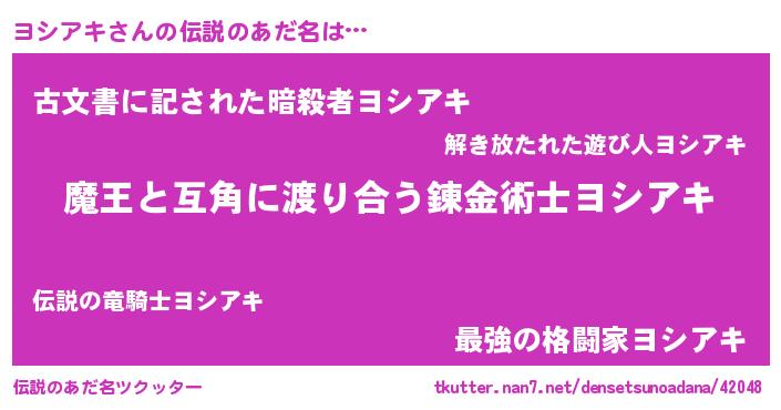 | ヒーロー風カッコイイあだ名 | 『慈愛の使者ヨシアキ』『ネオヨシアキ』 |