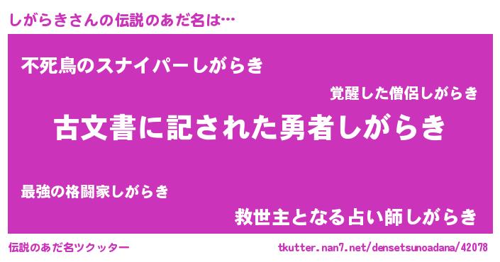 | 意味不明あだ名 | 『住所不定無職しがらき(89歳)』 |