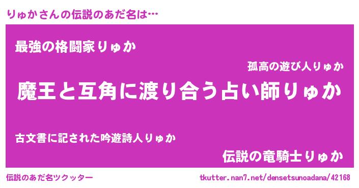 | ヒーロー風カッコイイあだ名 | 『慈愛の使者りゅか』『最強戦士リュカ』 |