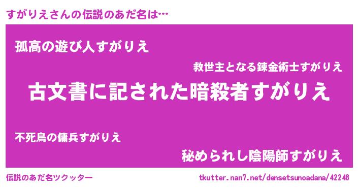 | 男性向けラノベタイトル風あだ名 | 『うちのすがりえが世界を掌握している!』 |