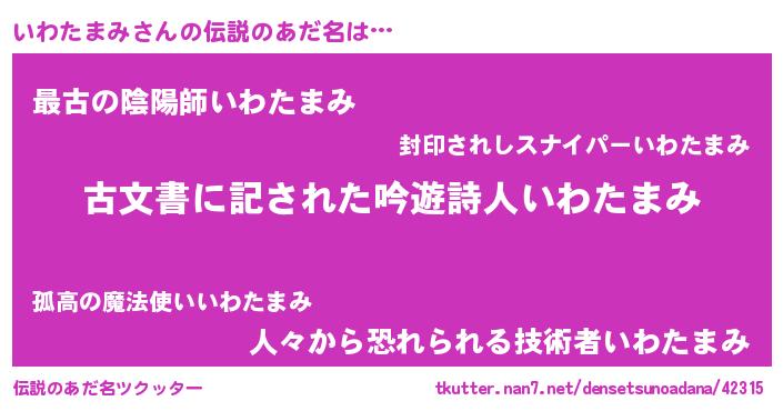 | 男性向けラノベタイトル風あだ名 | 『いわたまみ~年齢イコール彼女いない歴の魔法使い~』 |