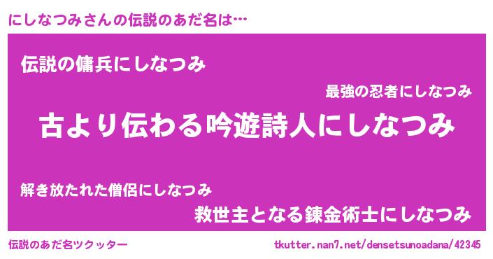 | 意味不明あだ名 | 『自称にしなつみ』『永久保存にしなつみ』 |