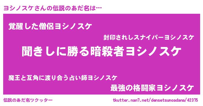 | 意味不明あだ名 | 『永久保存ヨシノスケ』『自称ヨシノスケ』 |