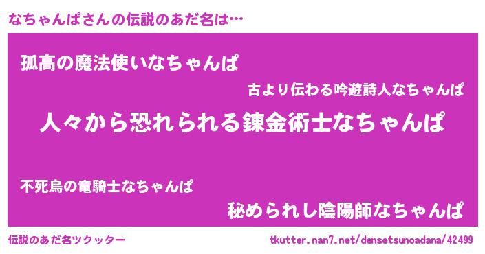 | 男性向けラノベタイトル風あだ名 | 『おまえをオタクにしてやるから、俺をなちゃんぱにしてくれ! 』 |