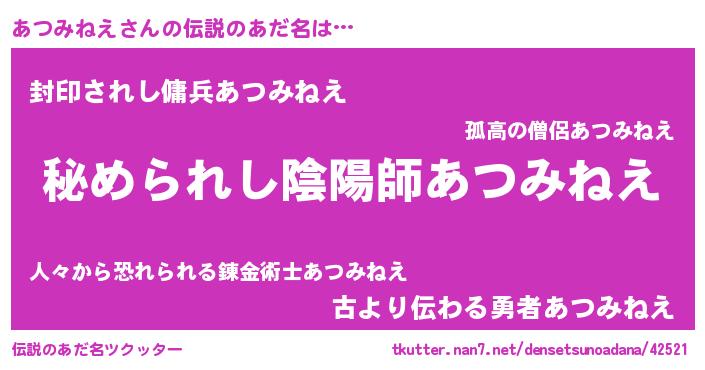| 男性向けラノベタイトル風あだ名 | 『アツミネエスレイヤー』 |