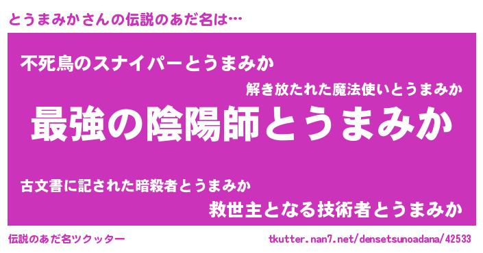 | 男性向けラノベタイトル風あだ名 | 『うちの娘の為ならば、俺はもしかしたらとうまみかも倒せるかもしれない。』 |