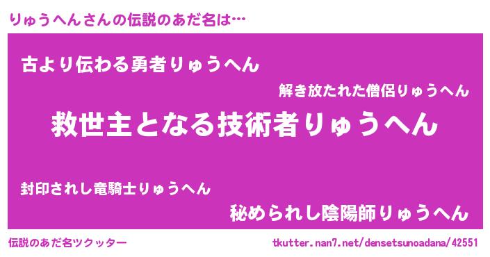 | 男性向けラノベタイトル風あだ名 | 『Re:りゅうへんから始める異世界生活』 |