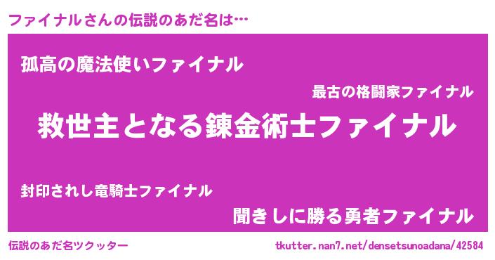 | 男性向けラノベタイトル風あだ名 | 『ファイナルに滅ぼされるだけの簡単なお仕事です』 |