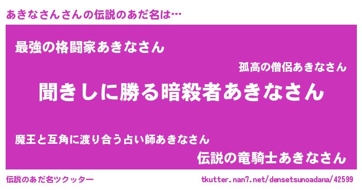 | 男性向けラノベタイトル風あだ名 | 『あきなさんという概念が存在しない退屈な世界 』 |