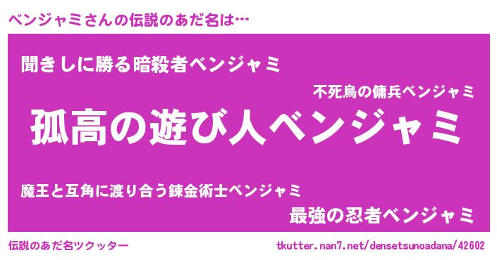 | 意味不明あだ名 | 『住所不定無職ベンジャミ(85歳)』 |