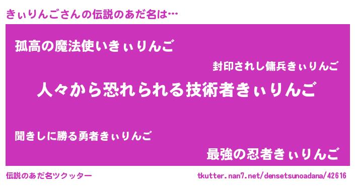 | ヒーロー風カッコイイあだ名 | 『正義の使者きぃりんご』『天弓騎士キィ』 |