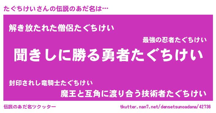 | ヘコむあだ名 | 『たぐちけい(苦笑)』『たぐっぺ』 |