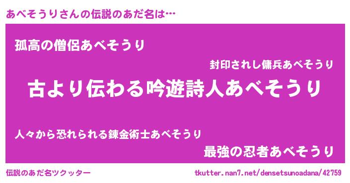 | 男性向けラノベタイトル風あだ名 | 『あべそうりという概念が存在しない退屈な世界 』 |