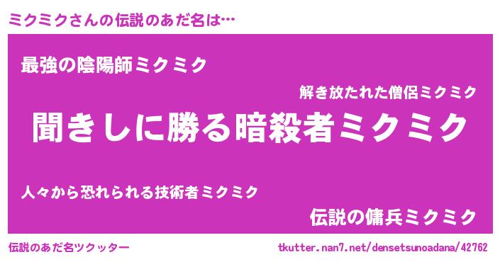 | ヘコむあだ名 | 『ミクミク(笑)』『牛乳』『ミク太郎』 |