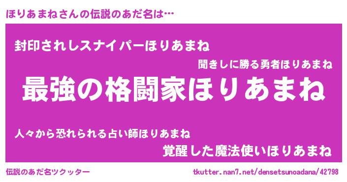 | 男性向けラノベタイトル風あだ名 | 『ほりあまねに滅ぼされるだけの簡単なお仕事です』 |