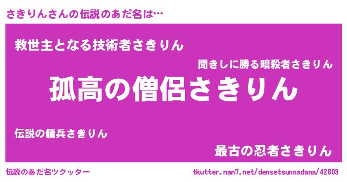 | 男性向けラノベタイトル風あだ名 | 『サキリンスレイヤー』 |