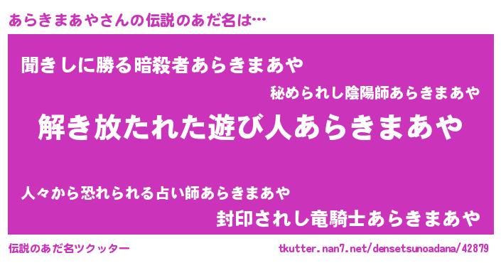 | ヒーロー風カッコイイあだ名 | 『仮面アラダー』『最強戦士アラキマアヤ』 |