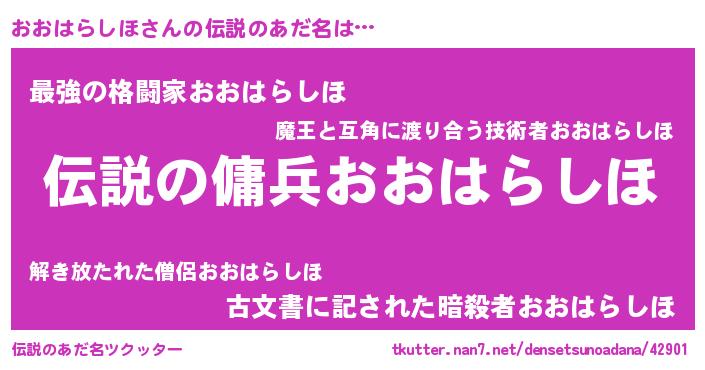 | 男性向けラノベタイトル風あだ名 | 『魔弾の王とおおはらしほ』 |