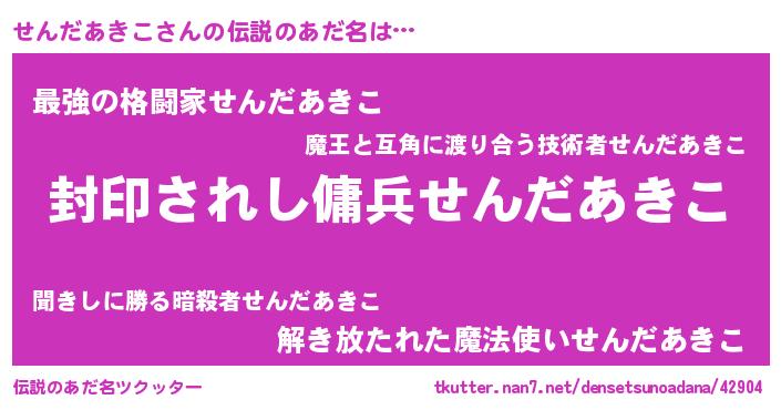 | ヒーロー風カッコイイあだ名 | 『スーパーセンダアキコ』『天弓騎士セン』 |