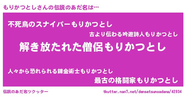 | 男性向けラノベタイトル風あだ名 | 『もりかつとしの嫁は女の子じゃないと思った?』 |