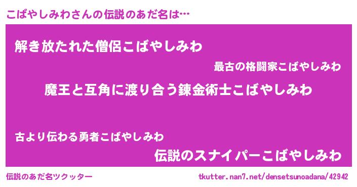 | ヒーロー風カッコイイあだ名 | 『愛の使者こばやしみわ』『幻影騎士コバ』 |