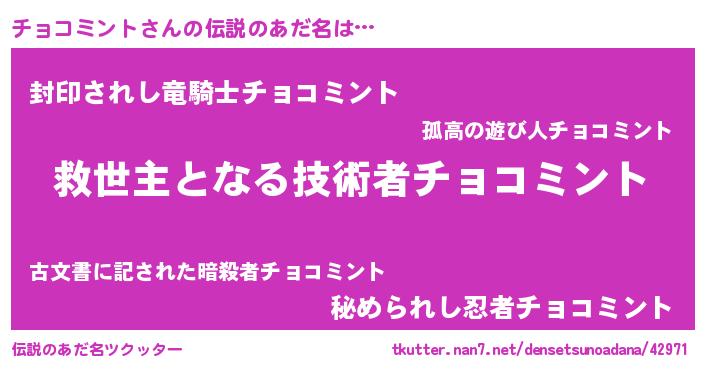 | 男性向けラノベタイトル風あだ名 | 『この素晴らしい世界にチョコミントを!』 |