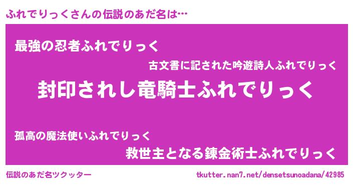 | 男性向けラノベタイトル風あだ名 | 『ふれでりっく~年齢イコール彼女いない歴の魔法使い~』 |