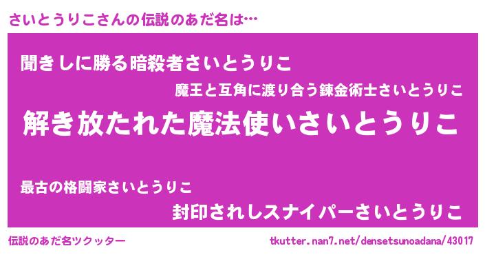 | 意味不明あだ名 | 『とにかく怪しいさいとうりこ』 |