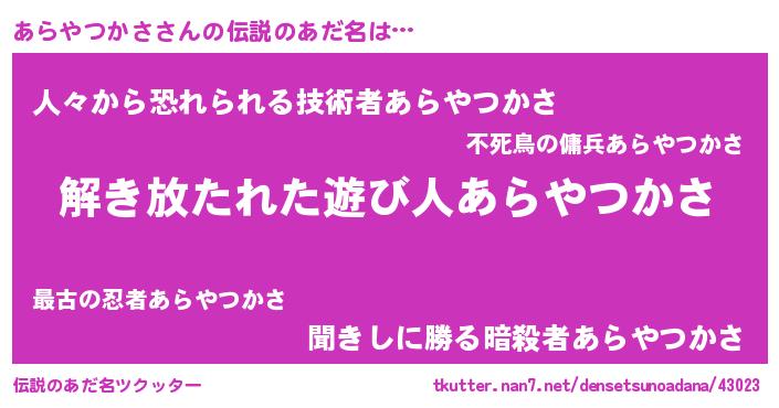 | 意味不明あだ名 | 『とにかく怪しいあらやつかさ』 |