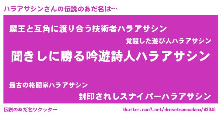 | 男性向けラノベタイトル風あだ名 | 『ハラアサシンという概念が存在しない退屈な世界 』 |