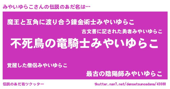 | ヒーロー風カッコイイあだ名 | 『スーパーミヤイユラコ』『天弓騎士ミヤ』 |