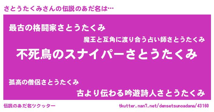 | ヒーロー風カッコイイあだ名 | 『スーパーサトウタクミ』『仮面サトダー』 |