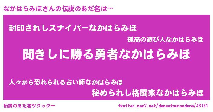 | ヘコむあだ名 | 『なかはらみほ(苦笑)』『なかにー』 |