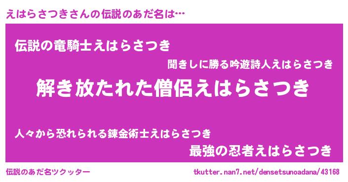 | 女子向けラノベタイトル風あだ名 | 『えはらさつきの卵を拾いまして』 |