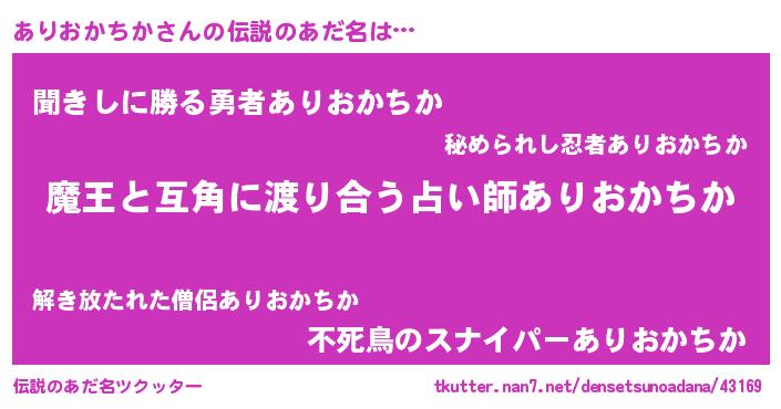 | 男性向けラノベタイトル風あだ名 | 『おまえをオタクにしてやるから、俺をありおかちかにしてくれ! 』 |