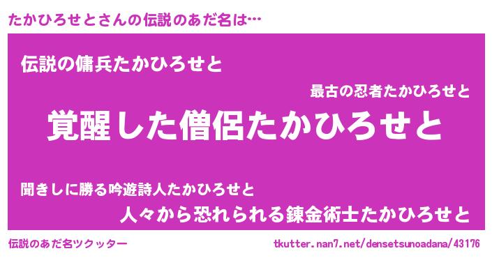 | ヒーロー風カッコイイあだ名 | 『天弓騎士タカ』『スーパータカヒロセト』 |